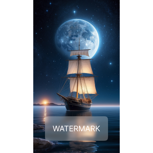 A ship sails under a colossal moon, with its sails unfurled against the twilight.