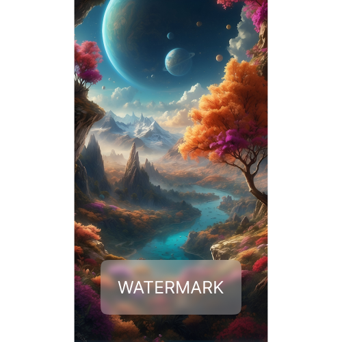 A fantastical valley blooms under the gaze of giant planets, with trees in hues of orange, pink, and purple.